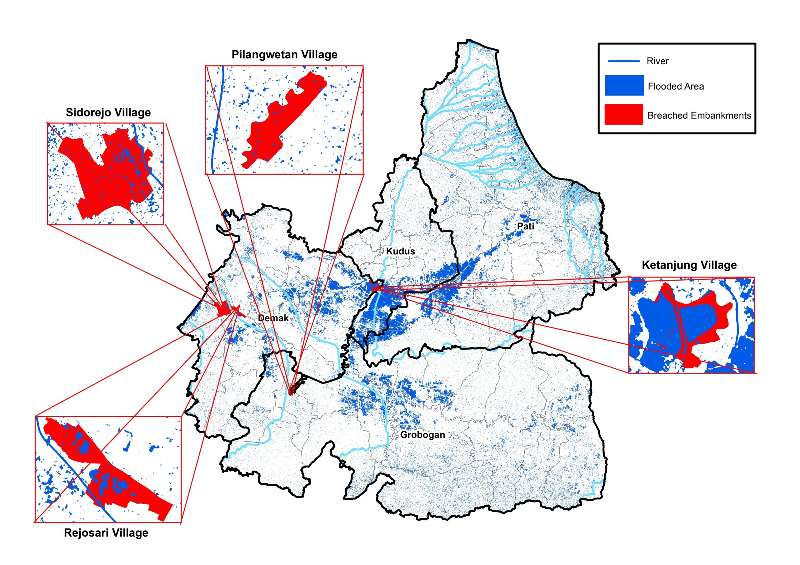 Figure 2. Location of the breached embankments surrounding the Central Java Source: RDI Staff Analysis on Sentinel-1 SAR, Badan Informasi Geospasial, n.d.)