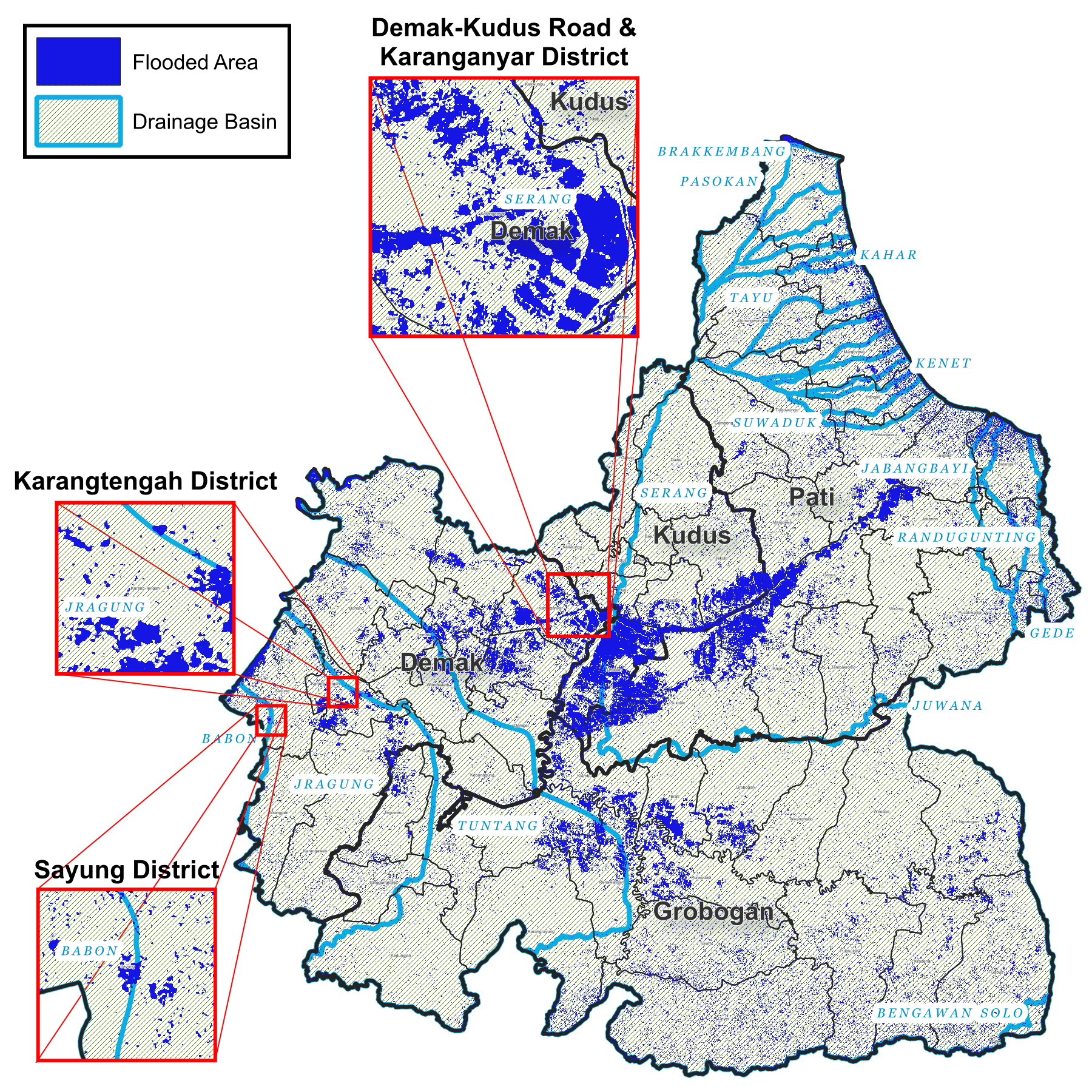 Situated in four different drainage basins (Babon, Jragung, Tuntang, and Serang) (Figure 3), the Wulan River's capacity needs to be optimised, as the current limit (900 m³/s) has proven unreliable. A case in Karanganyar District highlighted the importance of paying greater attention to river maintenance. For this reason, the Ministry of Public Works and Housing has committed to carrying out river normalisation to increase its capacity with an estimated budget of IDR 900 billion. In addition, with the ever-increasing pace of climate change, enhancing disaster risk management in Demak and the surrounding Central Java regencies can be built around:- Strengthening communities