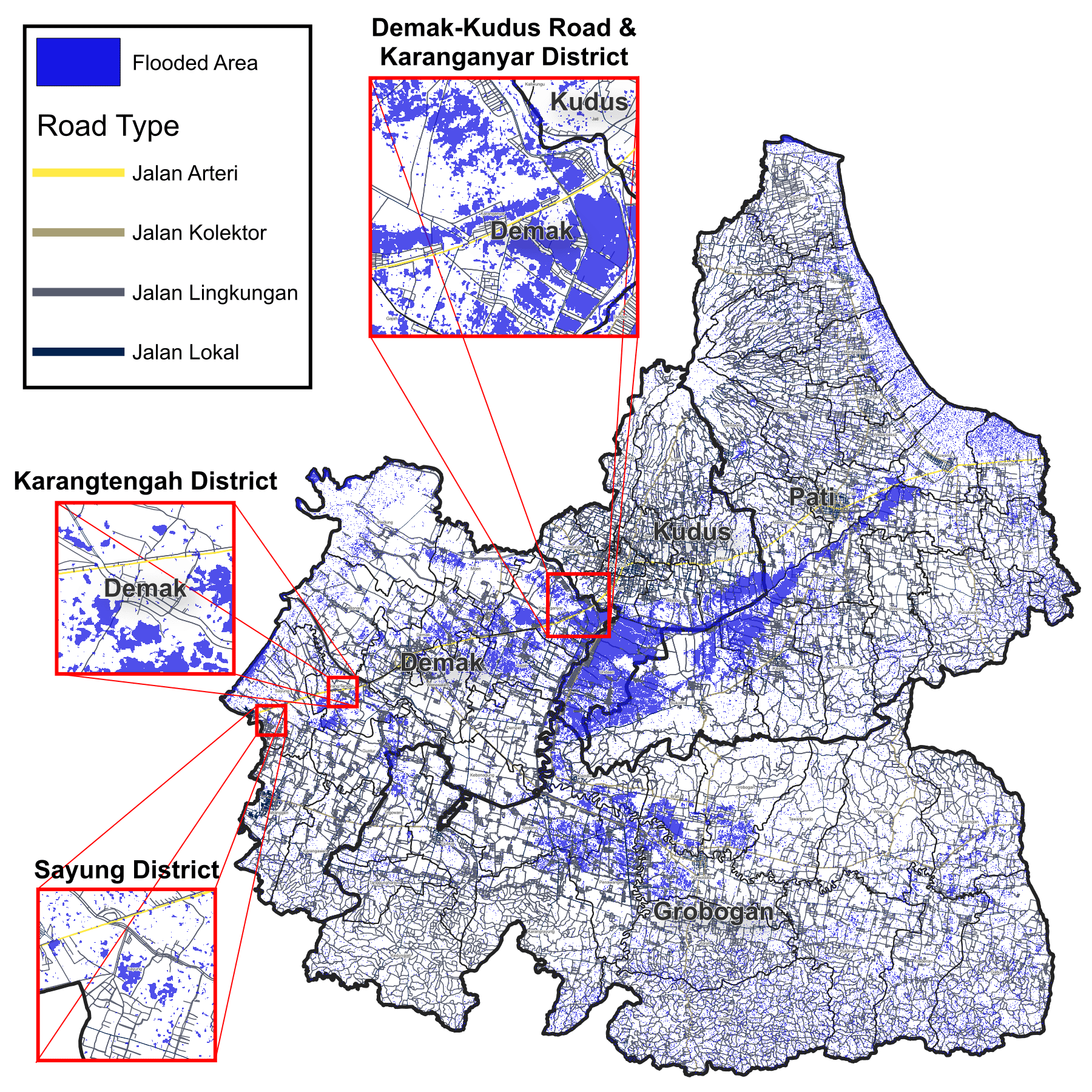 Figure 1. Inundated roads surrounding the Central Java Source: RDI Staff Analysis on Sentinel-1 SAR, Badan Informasi Geospasial, n.d.)